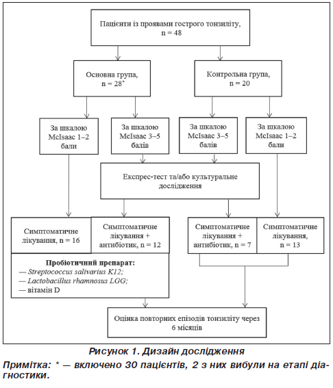 За допомогою онлайн-генератора випадкової вибірки пацієнти були рандомно розподілені на дві групи: до основної увійшли 28 дітей, які протягом 20 днів у комплексному лікуванні отримували пробіотичну добавку; контрольну групу становили 20 дітей, яким призначали стандартну терапію без пробіотика. Згідно з дизайном дослідження всім дітям з гострим тонзилітом проводилась оцінка за шкалою McIsaac, що дозволило визначити обсяг обстеження та лікування, зокрема потребу призначення антибактеріального препарату. У ході збору анамнезу також з’ясовували наявність чи відсутність інших епізодів гострого тонзиліту, а через 6 місяців після закінчення лікування провели аналіз його рекурентності.