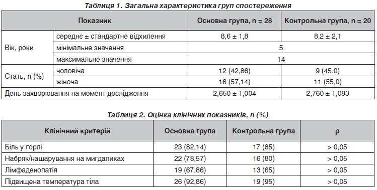 Усі вказані клінічні критерії входять у шкалу McIsaac, що дозволило за кількістю набраних балів, а саме більше трьох, та використання експрес-тесту чи бактеріологічного посіву верифікувати бактеріальну природу захворювання у 12 (42,86 %) та 7 (35 %) дітей основної та контрольної груп відповідно. Серед збудників переважав бета-гемолітичний стрептокок групи А (GABHS, group A beta-hemolytic streptococcus), що стало підставою до призначення антибактеріальних препаратів. У більшості випадків згідно з чинною настановою пацієнти отримували захищені чи незахищені амінопеніциліни, а в окремих випадках, зокрема на фоні розвитку ускладнень (паратонзилярний абсцес), — цефалоспорини третьої генерації. Також усі діти місцево застосовували бензидаміну гідрохлорид, а за потребою — жарознижувальну, протизапальну та знеболювальну терапію препаратами парацетамолу або ібупрофену. Пацієнтам основної групи паралельно із стандартним лікуванням було призначено пробіотик, що містить культури живих бактерій Streptococcus salivarius K12, Lactobacillus rhamnosus LGG® та вітамін D.