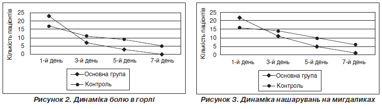 Характеризуючи локальні зміни, слід зауважити, що нашарування на мигдаликах були жовто-білого кольору у вигляді суцільних або фолікулярних нашарувань, які легко знімались шпателем, не залишаючи ерозованої поверхні. У ході лікування у пацієнтів основної групи ми отримали чітку вірогідну різницю вже на 3-й день лікування, адже наведені дані демонструють регрес локальної симптоматики у 50 % пацієнтів. Аналогічною була тенденція на 5-й та 7-й день лікування.