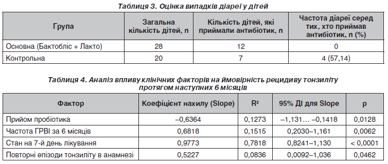 Актуальність. Тонзиліт становить приблизно 0,4 % амбулаторних звернень у країнах Європи та США. Зазвичай причиною захворювання є вірусна інфекція, а передача збудника відбувається повітряно-краплинним шляхом від пацієнтів із гострим тонзилітом. Бета-гемолітичний стрептокок групи А (group A beta-hemolytic streptococcus) є причиною тонзиліту у 15–30 % дітей віком від 5 до 15 років, що збільшує ризик виникнення системних ускладнень. Метою дослідження стало вивчення ефективності застосування комплексного пробіотика, що містить культури живих бактерій Streptococcus salivarius K12 і Lactobacillus rhamnosus LGG та вітамін D у вигляді холекальциферолу, у комплексному лікуванні гострого тонзиліту у дітей. Матеріали та методи. У дослідженні взяло участь 48 дітей віком від 5 до 14 років, які шляхом випадкової вибірки були розподілені на дві групи: до основної увійшло 28 дітей, які протягом 20 днів у комплексному лікуванні отримували пробіотичну добавку; до контрольної групи увійшло 20 дітей, яким призначали стандартну терапію без пробіотика. Усім дітям проводилась оцінка за шкалою McIsaac, що дозволило визначити обсяг обстеження та лікування. Результати. Бактеріальна природа захворювання була верифікована у 12 (42,86 %) та 7 (35 %) дітей основної і контрольної груп відповідно. Дітям призначено антибактеріальний препарат. За віком, статтю, тривалістю захворювання та клінічним перебігом тонзиліту на початку спостереження пацієнти не відрізнялися (р > 0,05). У хворих обох груп з однаковою частотою спостерігалися біль у горлі, набряк/нашарування на мигдаликах, лімфаденопатія, лихоманка. Характеризуючи динаміку локальних симптомів у ході лікування, слід зауважити, що більш ніж у третини дітей, які отримували пробіотичну добавку, біль в горлі зник вже на 3-й день, на відміну від пацієнтів контрольної групи, де майже кожен третій пацієнт (30 %) продовжував скаржитися на біль в горлі навіть на 7-й день захворювання. Середня тривалість болю в горлі у дітей основної групи становила 2,67 ± 0,62 дня, у хворих контрольної групи — 4,91 ± 1,16 дня (p < 0,05). Аналогічну динаміку ми отримали, оцінюючи наявність чи відсутність набряку та нашарувань на мигдаликах. Через 6 місяців були оцінені такі критерії, як рецидив тонзиліту та частота гострих респіраторних захворювань, проведений аналіз чинників, які корелюють з ними. Слід зауважити, що стан на 7-й день лікування виявився найбільш сильним предиктором розвитку рецидиву (R2 = 0,78). Тобто досягнення повної клінічної ремісії до 7-го дня перебігу гострого тонзиліту суттєво знижує формування схильності до хронізації та виникнення повторних епізодів. Другим важливим критерієм був прийом пробіотика, який також асоціюється зі зниженням ризику повторних рецидивів (p = 0,0128). Висновки. Призначення пробіотика у лікуванні гострого тонзиліту збільшує ймовірність клінічного одужання до 7-го дня захворювання та відповідно знижує частоту рецидивів у найближчому майбутньому. Дана модель має добру прогностичну цінність (AUC = 0,75, 95% ДІ 0,6495–0,8505; p < 0,0001) та свідчить, що застосування пробіотика Streptococcus salivarius K12 і Lactobacillus rhamnosus LGG та вітаміну D знижує ризик повторного епізоду тонзиліту у дітей.