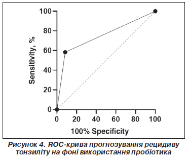 Також слід зауважити, що серед досліджених чинників стан на 7-й день лікування виявився найбільш сильним предиктором розвитку рецидиву (R2 = 0,78). Тобто досягнення повної клінічної ремісії до 7-го дня перебігу гострого тонзиліту суттєво знижує формування схильності до хронізації та виникнення повторних епізодів. Другим важливим статистично значущим критерієм був прийом пробіотика, який також асоціюється зі зниженням ризику повторних рецидивів (p = 0,0128). Отже, отримані результати дозволяють чітко відтворити логічну клінічно ефективну послідовність: застосування пробіотика у лікуванні гострого тонзиліту + одужання до 7-го дня захворювання = запобігання рецидивам у найближчому майбутньому (рис. 4). У ході статистичних обрахунків ми отримали модель, яка має добру прогностичну цінність (AUC = 0,75; 95% ДІ 0,6495–0,8505; p < 0,0001) та вказує на те, що застосування пробіотика дійсно знижує ризик повторного епізоду тонзиліту.