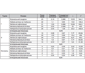 Background. Corneal diseases are a common cause of visual impairment, which requires timely diagnosis and objective assessment of its condition. The paper analyzes modern corneal staining scales and proposes a method of integral scoring. The method allows to quantify the severity of symptoms, monitor the course of the disease and the effectiveness of therapy. Objective: to develop a modified integral corneal scoring scale by analyzing the methods of existing scoring scales and to evaluate its effectiveness in corneal diseases. Materials and methods. Two observation groups were selected for the evaluation. The first one consisted of patients after keratitis (acute phase), 20 eyes, the second group included people with chronic dystrophic corneal diseases (chronic phase), 18 eyes, and the control group — 20 eyes (second, healthy eye). Results. The study analyzed the nature of corneal neovascularization. In group I (acute inflammatory and traumatic conditions), superficial neovascularization was observed in 50 % of cases (6 eyes), deep one in 33 % (4 eyes), and mixed one in 17 % (2 eyes). In group II (patients with corneal dystrophies), deep vascularization prevailed in 46 % of cases (6 eyes), while superficial vascularization was observed in 30.7 % (4 eyes) and mixed vascularization in 23.1 % (3 eyes). These results confirm that superficial neovascularization is characteristic of acute processes, and deep neovascularization — of chronic degenerative changes. For the quantitative analysis of clinical signs, the method of integral scoring with symptom ranking was used. It was found that in group I the average integral index of symptom severity was 0.7, in group II — 0.2, and in the control group — 0.01. This indicates the presence of moderate or mild symptoms in dystrophies and its absence in healthy individuals. The proposed method of ranking allows us to objectively assess the severity of corneal lesions, their dynamics and the effectiveness of the treatment. Conclusions. An integrated approach to assessment allows not only to quantify clinical symptoms but also provides the ability to track the dynamics of the disease, identify trends in progression or regression, and evaluate the effectiveness of the therapy. This approach is recommended for use in both clinical practice and research.